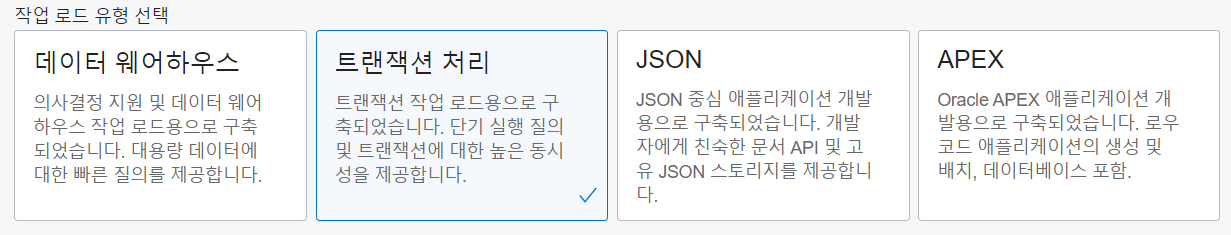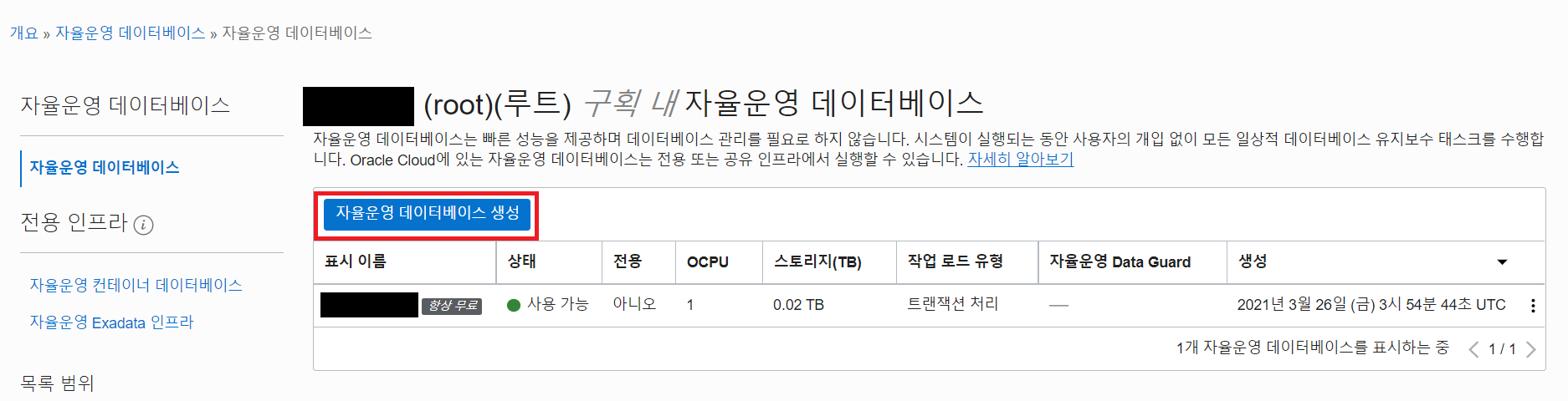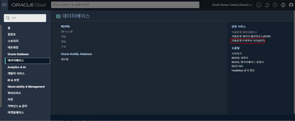로그인 후 메뉴 - 데이터베이스 - 자율운영 트랜잭션 처리(ATP)를 클릭