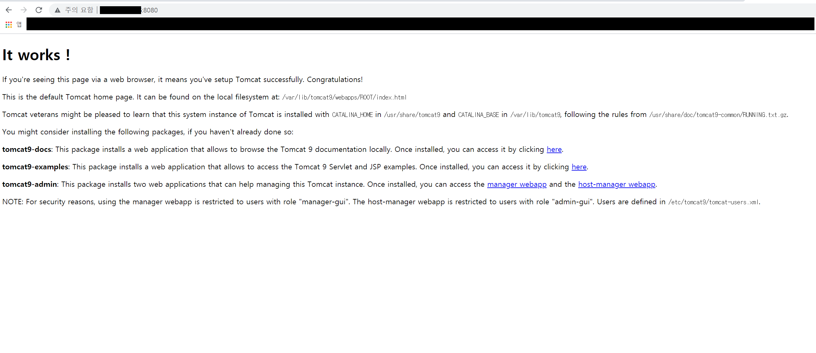 이후 수신 규칙 추가가 완료되면 주소창에 http://[공용IP주소]:8080를 입력해보면 톰캣 디폴트페이지가 나온다.