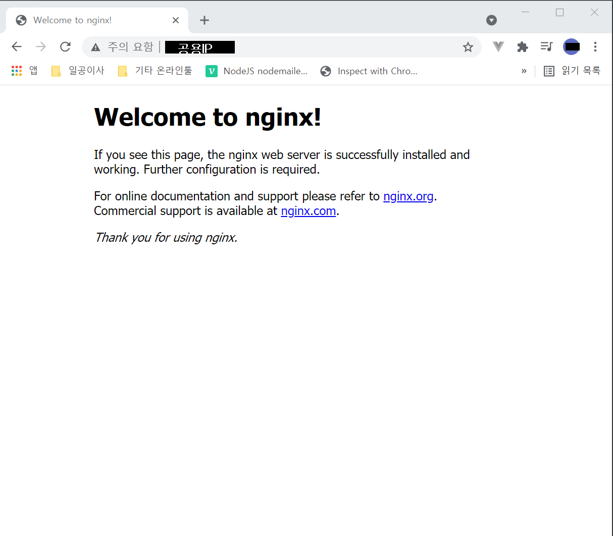 nginx 를 설정해야할 차례다. nginx를 까는 순간부터 실행되고 있으니 http://[공용IP]로 접속하여 잘 접속되는지부터 확인하자