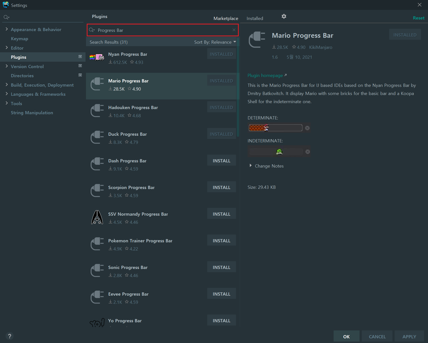 Plugins의 Installed에서 Progress Bar 를 검색하여 원하는 Progres Bar 플러그인에 체크해주시고 확인을 눌러주시면 재시작하라는 메세지가 나오는데요, 재시작해줍시다.