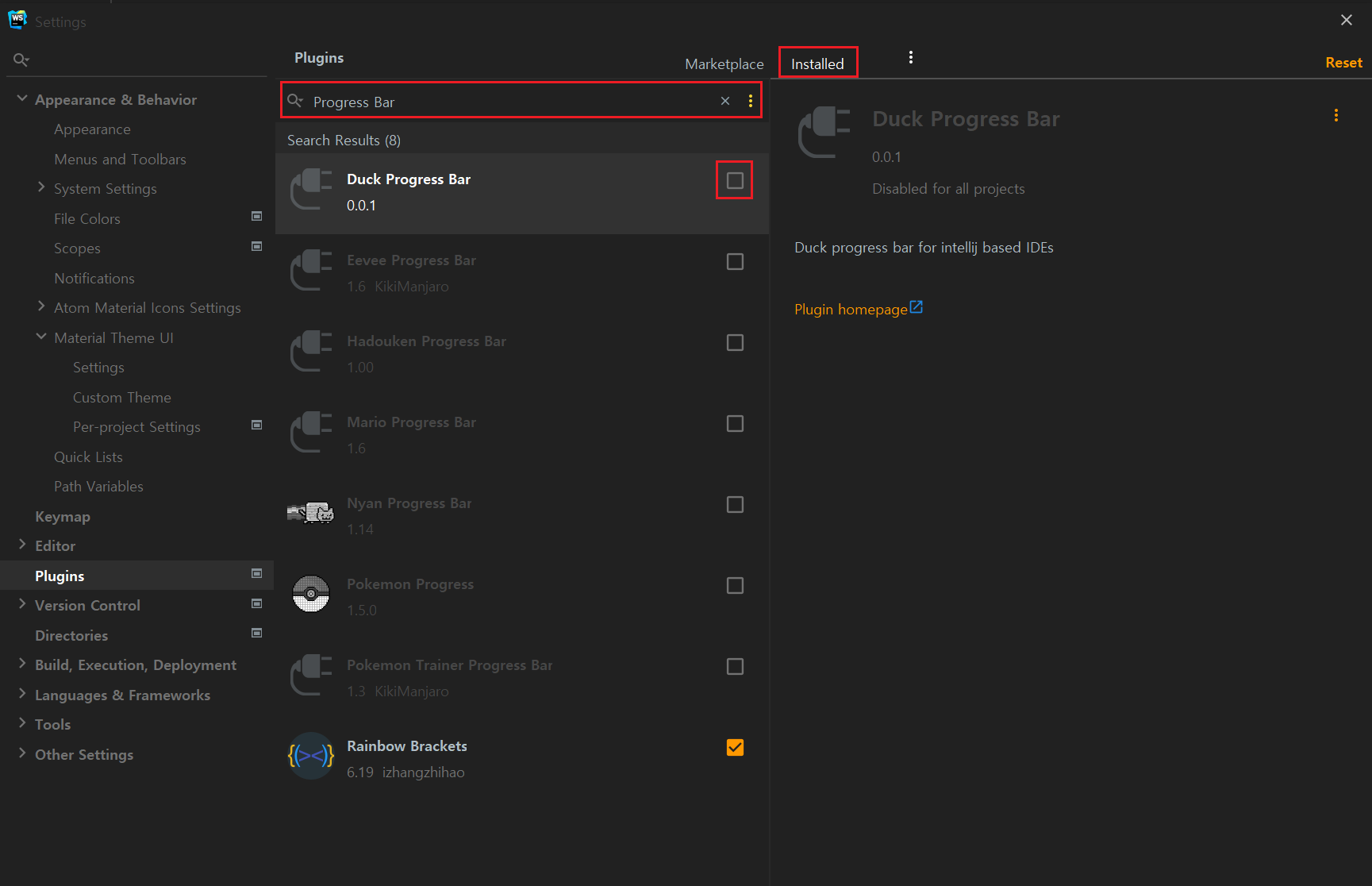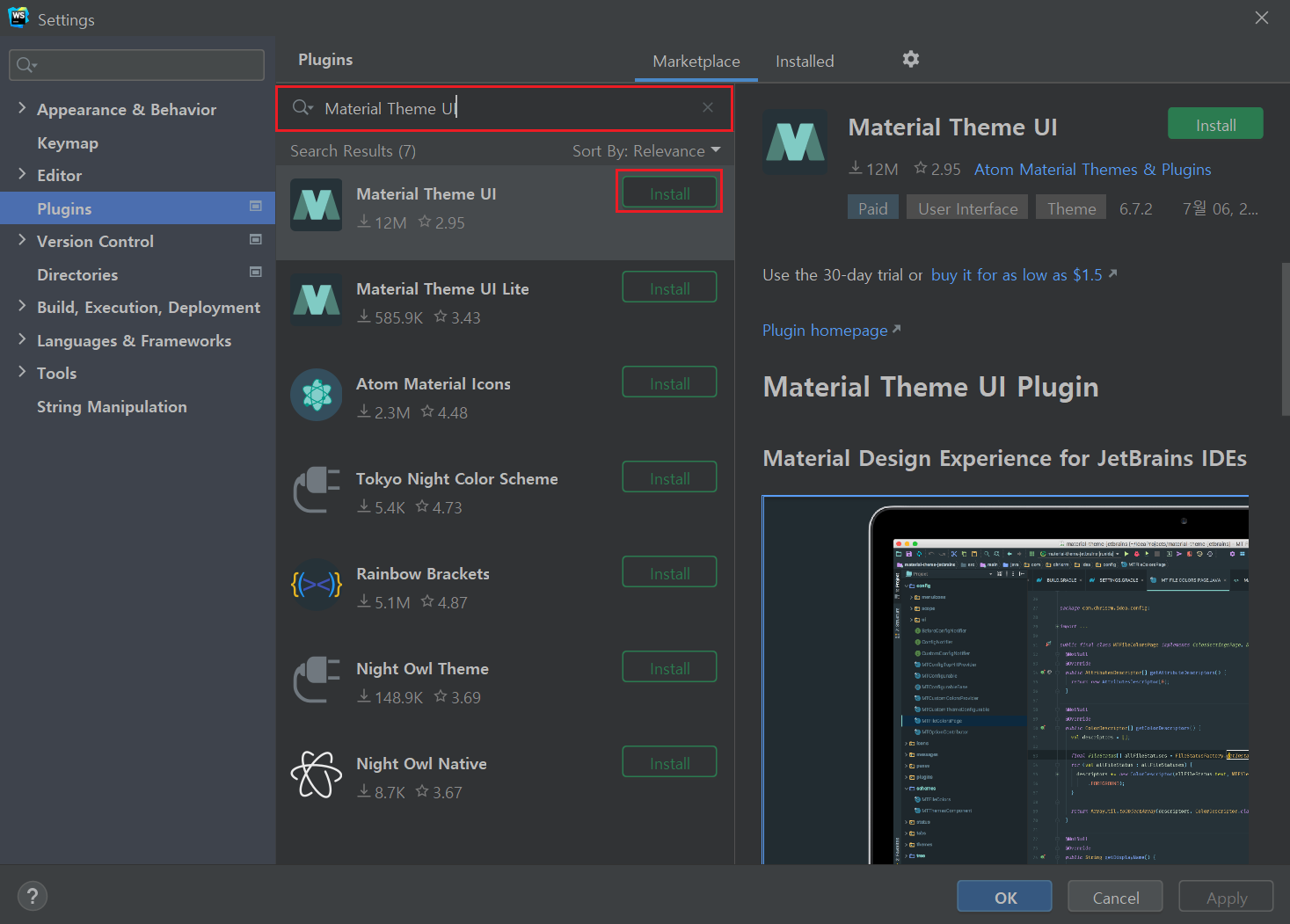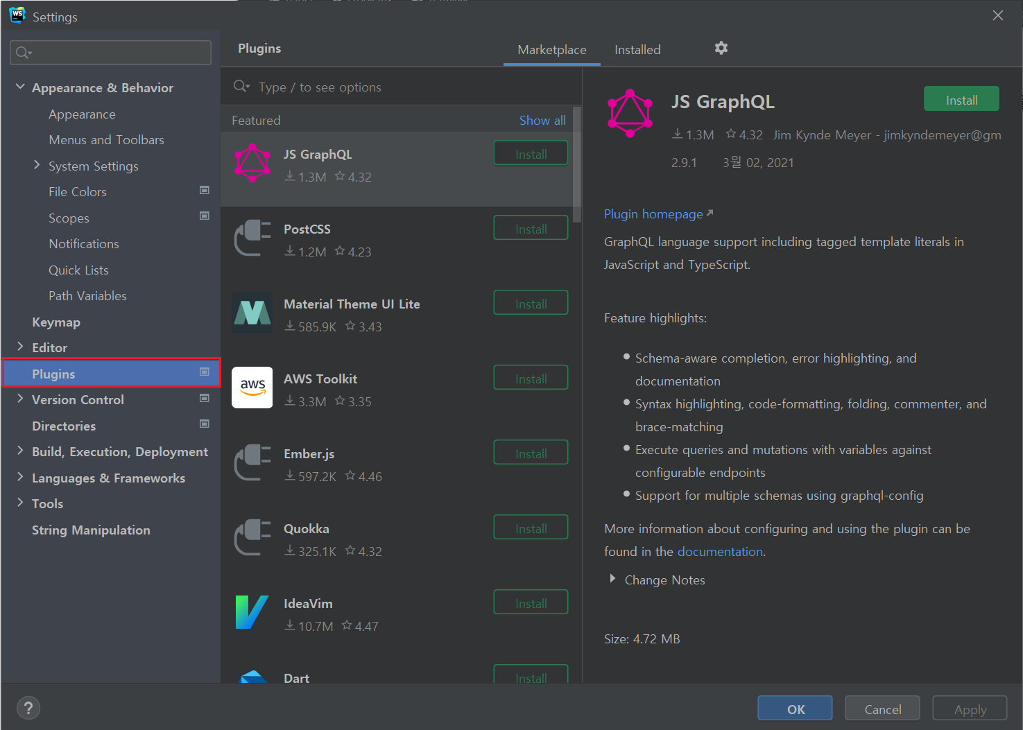 Marketplace는 말그대로 다운받을 수 있는 탭이고, Installed는 이미 설치된 플러그인을 확인할 수 있습니다.