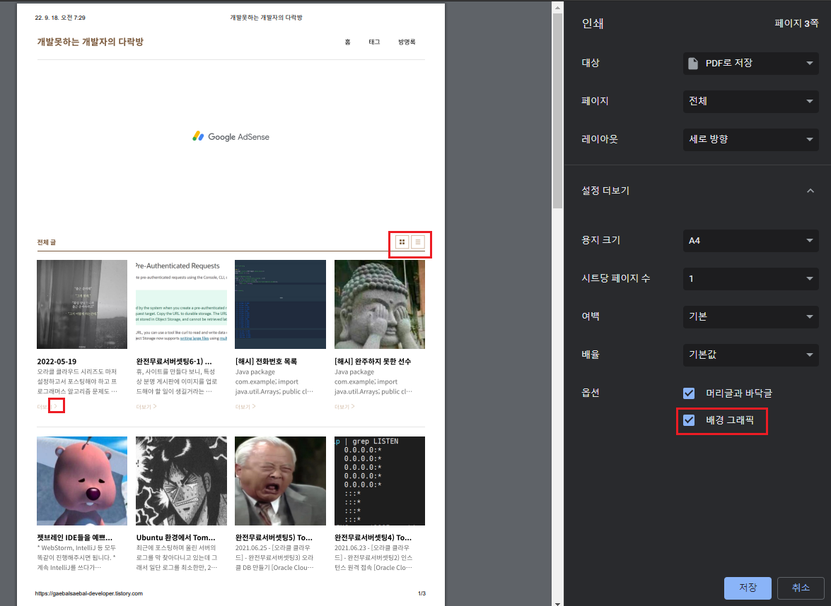 "\n인쇄하실 때 배경색 혹은 이미지가 나오지 않을 때 아래와 같이 설정해주세요." +