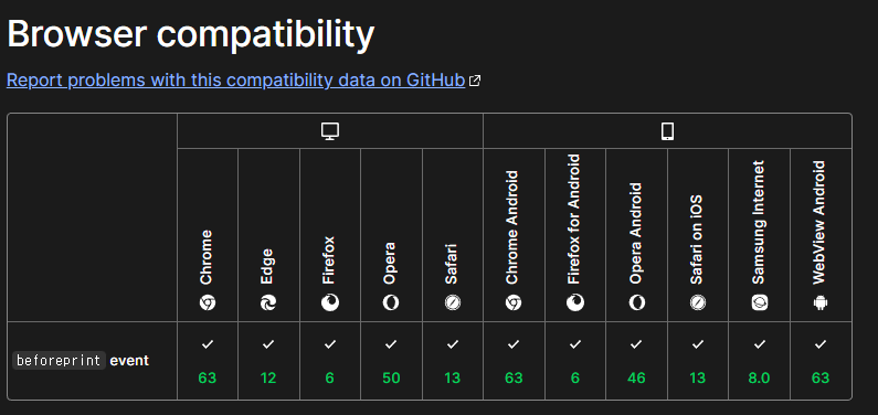 본인같은 경우에는 아래처럼 코딩해놓았다. 다만 beforeprint 이벤트는 아래 사양에서만 지원된다.