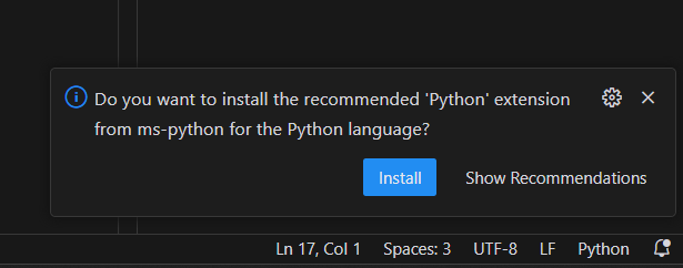 우리는 파이썬으로 ChatGPT와 대화하는 모바일 앱을 만들어 볼 것이기 때문에 /projects/python/main.py 파일을 열어보자. 그러면 오른쪽 하단에 아래와 같은 팝업이 뜨는데 Install을 눌러주면 자동으로 파이썬을 설치해준다.