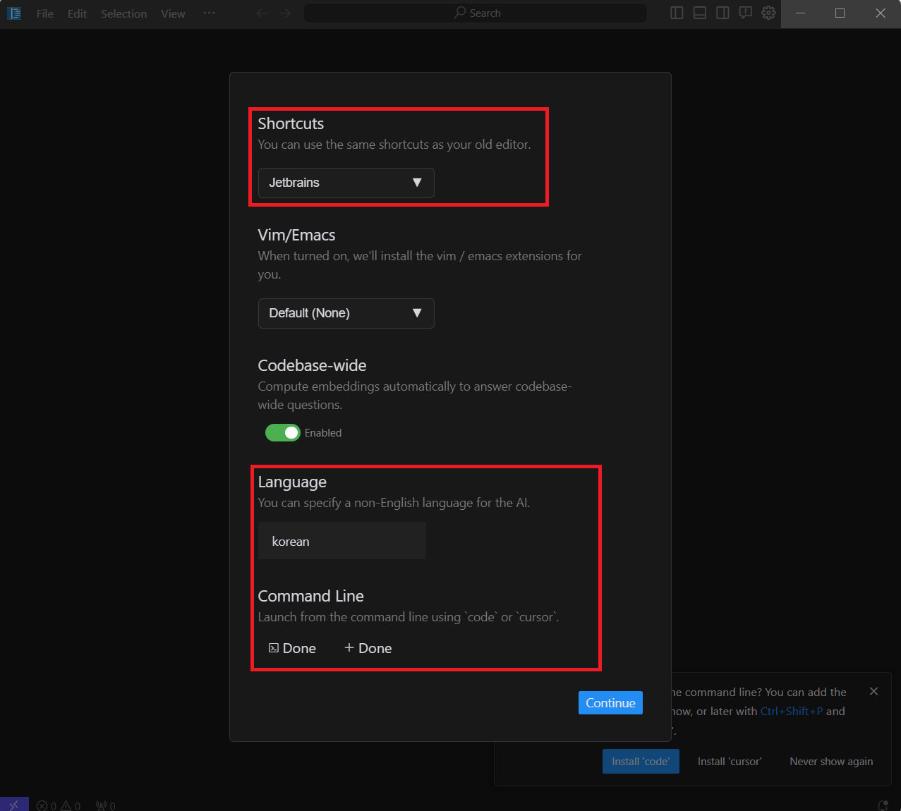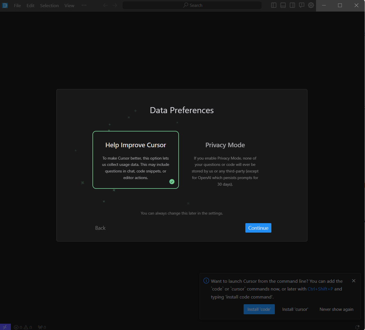 그냥 테스트 겸 해보는 거라면 그냥 Help Improve Cursor를 선택해 IDE 개발에 도움을 주자.