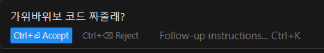 Cmd+K 또는 Ctrl+K를 누르면 gpt 에게 코드를 짜달라고 요청해 해당 코드를 자동으로 기입하도록 할 수 있다. 코드가 모두 작성된 뒤 파란 버튼을 누르거나, Cmd+Enter 또는 Ctrl+Enter를 누르면 accept 되는데, 이 버튼이 활성화되기 전까지는 작성중인 것이니 기다리자. (그냥 닫으면 코드 사라짐, ctrl+z하면 다시 돌아옴)