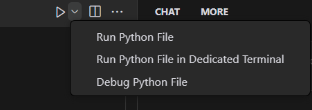 코드 입력칸 오른쪽 상단에 실행버튼을 누르면 Run, 그 옆 화살표를 누르면 실행 옵션이 나온다. 그 오른쪽은 화면 분할이 된다.