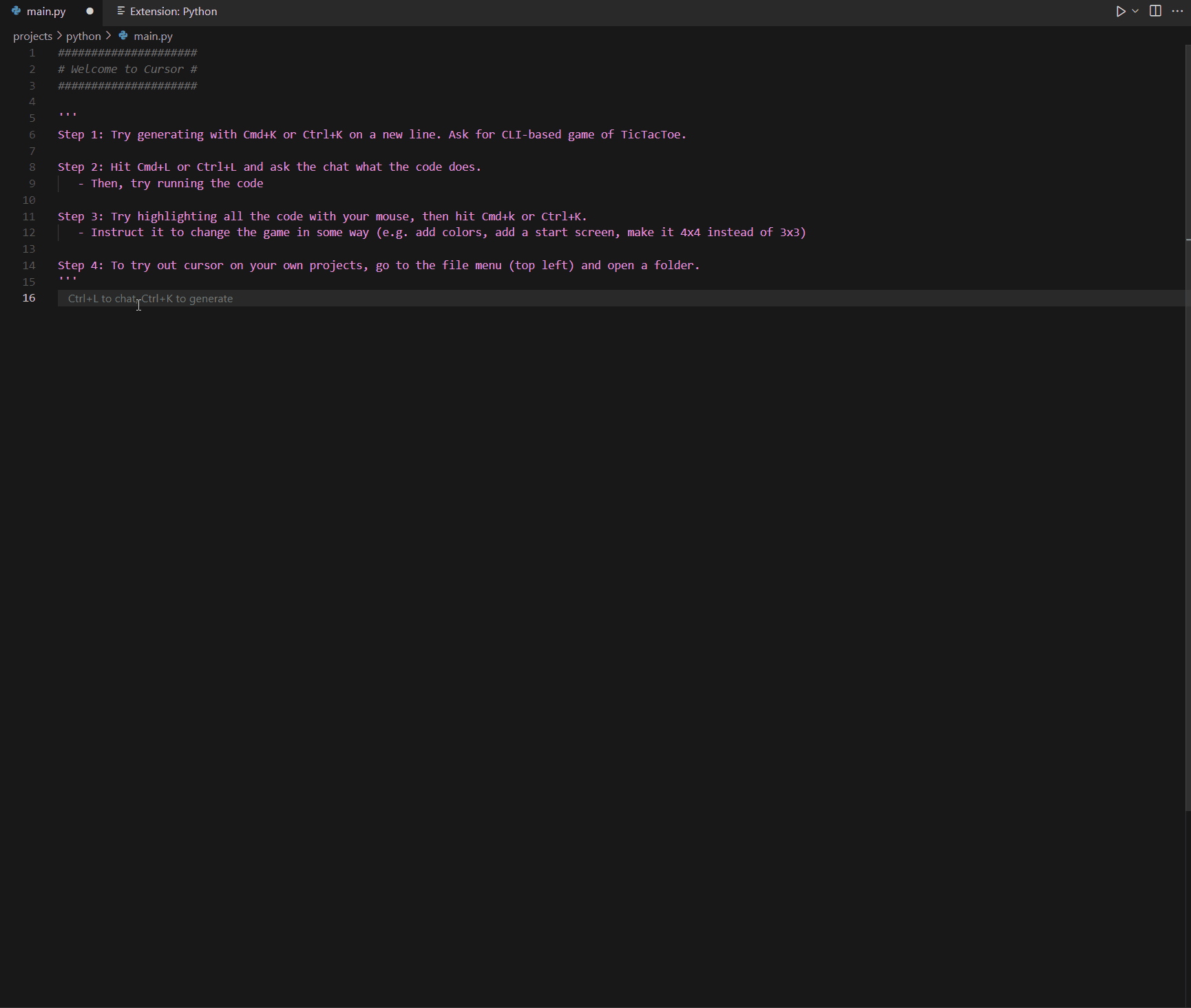Step 1: Try generating with Cmd+K or Ctrl+K on a new line. Ask for CLI-based game of TicTacToe.