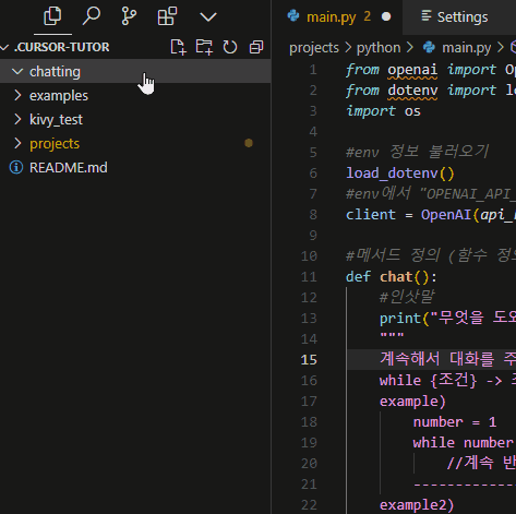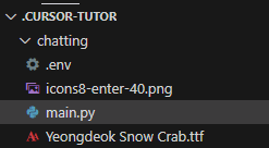 그 전에 터미널에서 pwd를 쳐보면 현재 경로가 어딘지 나온다. 만약 ...\.cursor-tutor 로 되어 있는지 확인하자. (혹은 본인이 지정한 워크스페이스)