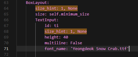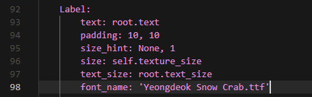 70번째 줄, 97(or 96)번째 줄 에서 엔터로 한 줄 추가해 아래 코드를 추가하는데 ' '안에는 본인이 다운로드 받은 폰트로 넣으면 된다.