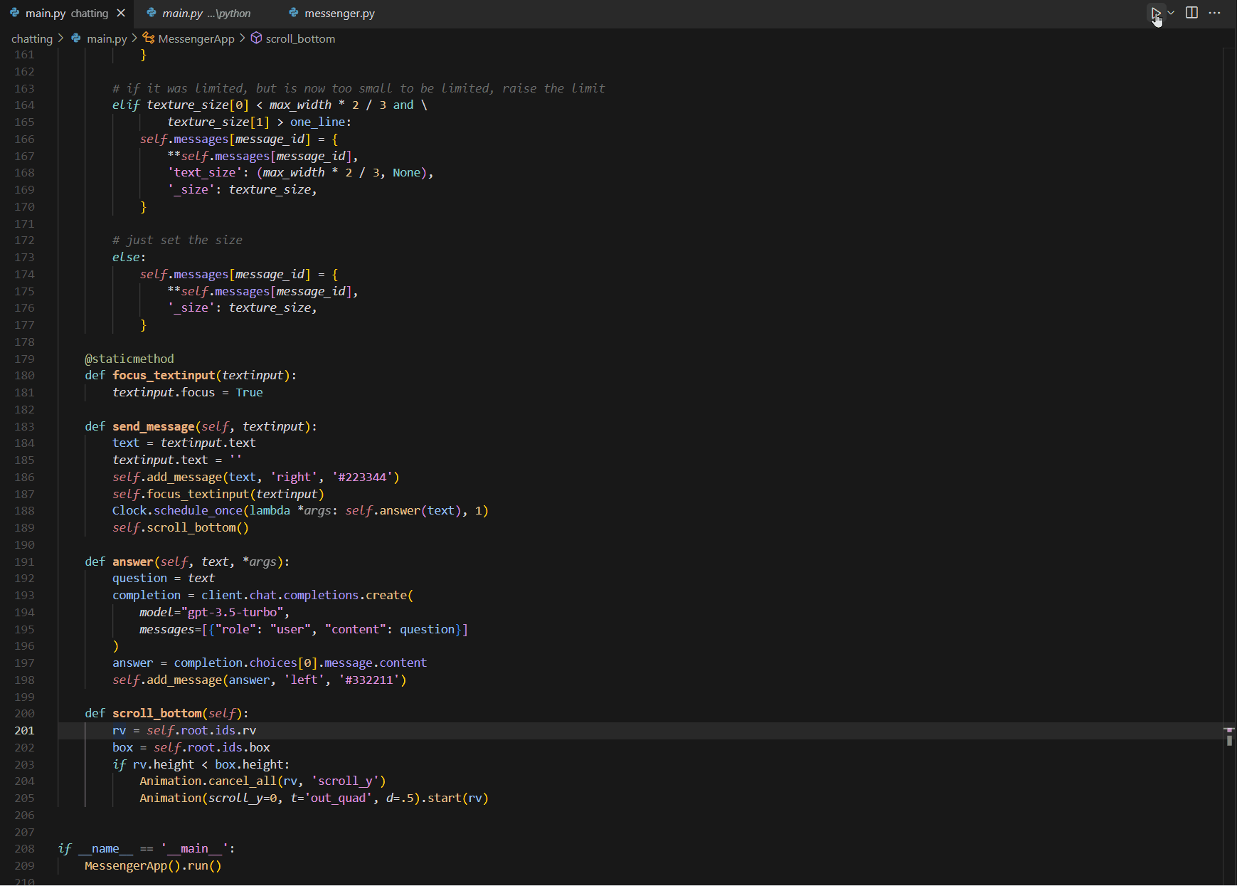비어있는 main.py에 kivy/examples/widgets/recycleview/messenger.py의 코드를 그대로 복사 붙여넣기 해보자.